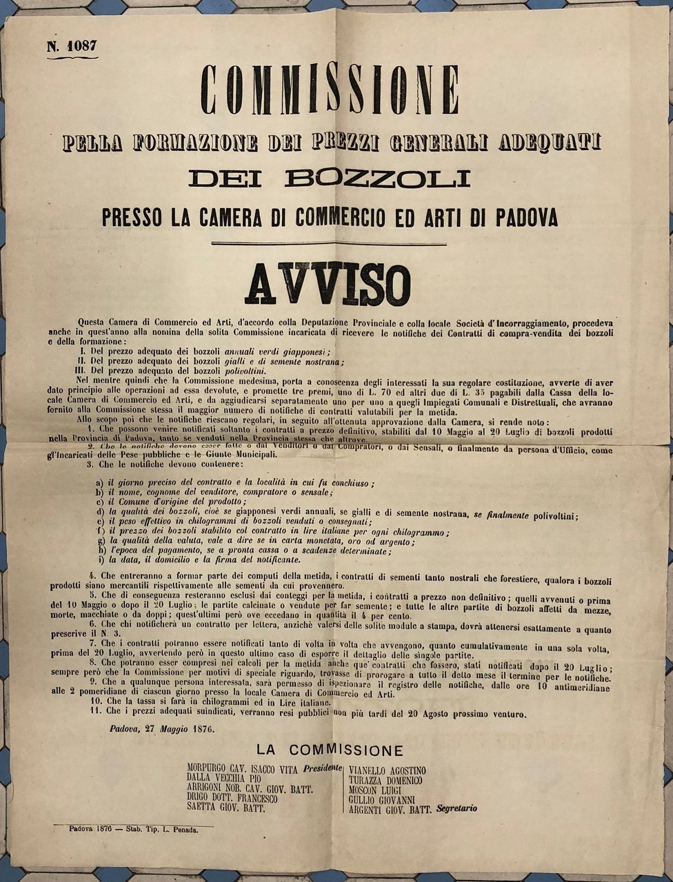 Commissione pella formazione dei prezzi generali adequati dei bozzoli presso la Camera di Commercio ed Arti di Padova. Nomina della Commissione incaricata di ricevere i contratti di compra-vendita dei bozzoli
