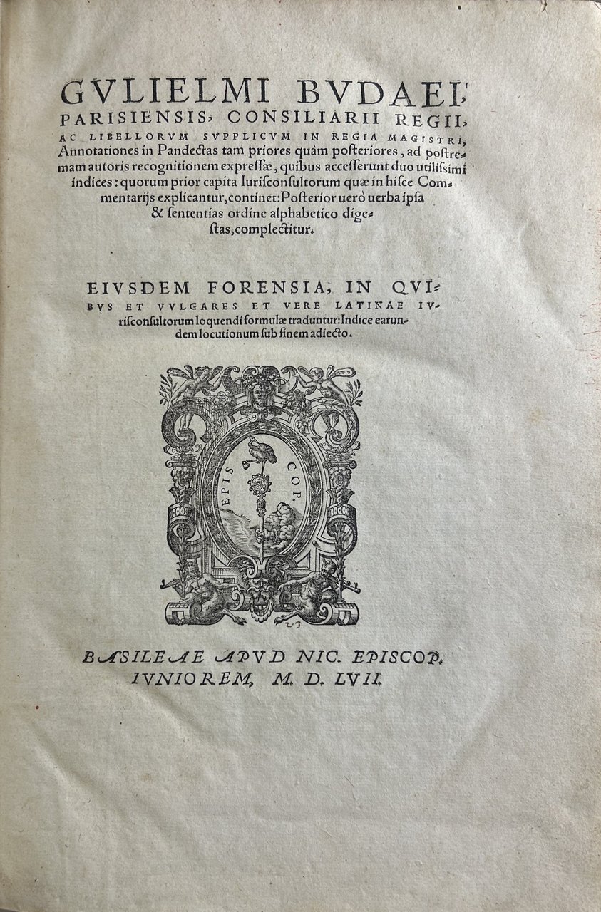 Consiliarii Regii, ac libellorum supplicum in Regia Magistri, Annotationes in Pandectas tam priores quam posteriores, ad postremam autoris recognitionem expressae, quibus accesserunt duo utilissimi indices: quorum prior capita Iurisconsultorum quae in hisce Commentarijs explicantur, continet: Posterior uero uerba ipsa & sententias ordine alphabetico digestas, complectitur. Eiusdem Forensia, in quibus et vulgares et vere latinae iurisconsultorum loquendi formulae traduntur. UNITO A: Forensia. Consiliarii Regii, libellorum'que magistri in praetorio. | Libros antiguos y modernos | Bude Guillaume (1467-1540) - Budaei Gulielmi (1467-1540)