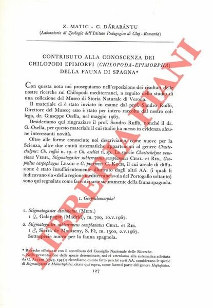 Contributo alla conoscenza dei Chilopodi Epimorfi (Chilopoda Epimorpha) della fauna di Spagna. | Libros antiguos y modernos | Matic Z. - Darabantu C.