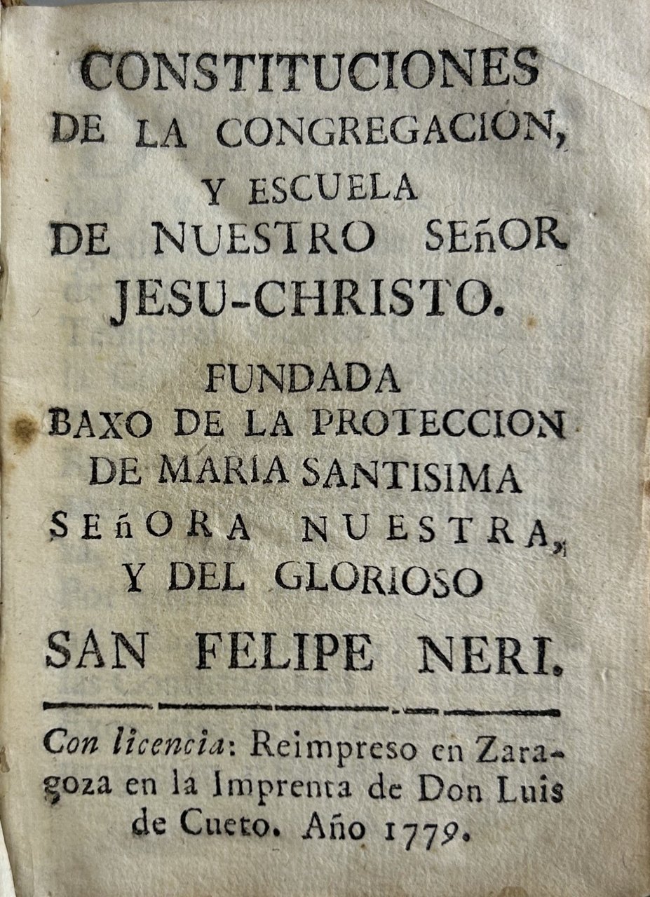 Costituciones de la congregacion, y escuela de nuestro Senor Jesu Christo. Fundada baxo de la proteccion de Maria Santisima Senora nuestra, y del glorioso San Felipe Neri | Libros antiguos y modernos | San Filippo Neri