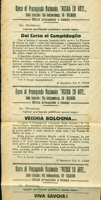 Dal Carso al Campidoglio. Vecchia Bologna. Viva Savoia!