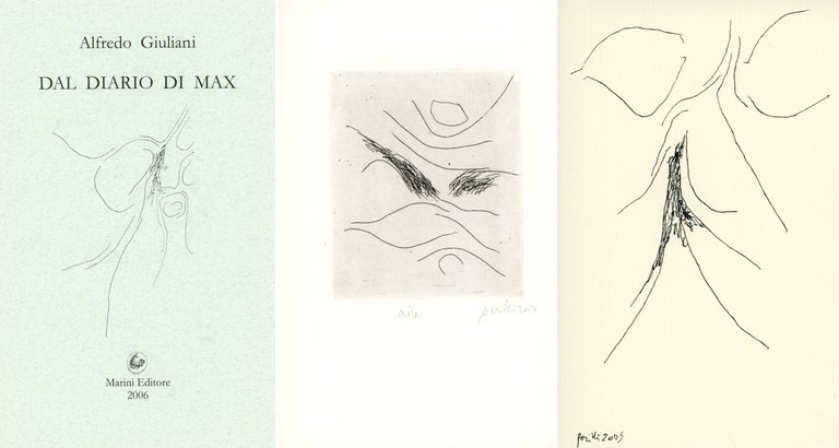(Pensieri e ridevoli patacchi). Riproduzione di sei disegni inediti di Achille Perilli. Al controfrontespizio un'acquaforte originale di Perilli, realizzata appositamente per questa edizione (cm 10x8,5) in 50 esemplari numerati e firmati. Uno dei 6 esemplari con allegato un disegno originale di Perilli Stampato su carta Velina Magnani. Acquaforte tirata a Milano nella stamperia di Giorgio Upiglio, su carta Sicars di Sicilia. 8vo. pp. 66. . Perfetto (Mint). . Prima ed. di 250 + XXV es. numerati e firmati. Letteratura italiana del 900 [Gambetti, 2007] Gambetti Lucio, Vezzosi Franco, Rarità bibliografiche del Novecento italiano. Repertorio delle edizioni originali. Milano, Edizioni Sylvestre Bonnard, 2007.