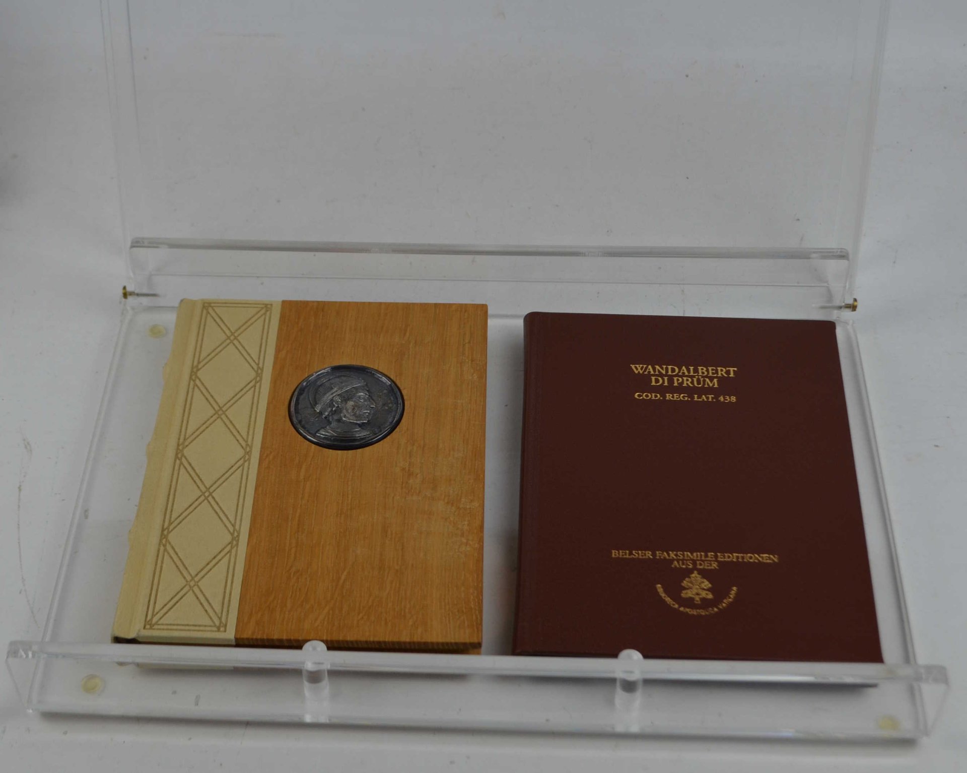 Due volumi di cm. 20, il primi con il facsimile impresso su pergamena con legatura in mezza pelle e legno e medaglione al piatto anteriore. Il secondo di commentario di pp. 96, legato in pelle con titoli in oro. Preservati in bella custodia in plexiglass.