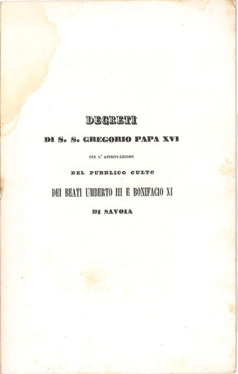 In 8vo (mm. 200 x 127). Pp. 21, [2]. Opuscolo cucito, ma senza legatura. Carta leggermente brunita e alcuni aloni e macchie in fine. Fregio xilografico posto all'inizio dell'Introduzione. Raccolta di decreti emanati da papa Gregorio XVI (al secolo Bartolomeo Alberto Cappellari; 254º vescovo di Roma e papa della Chiesa cattolica dal 2 febbraio 1831 al 1 giugno 1846) il 7 settembre 1838: nel mese stesso fu stampato l'opuscolo. Tali decreti, presentati con testo a fronte in latino, riconoscono il culto di Umberto III conte di Savoia e Bonifacio XI, papa nel XIII secolo.