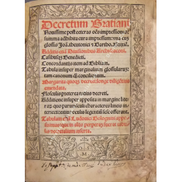 Decretum Gratiani nouissime postceteras omnes impressiones: summa adhibita cura impressum: vna cum glossis Ioa. Theutonici & Bartho. Brixie. Additis etiam diuisionibus Archidiaconi. Casibusque Benedicti concordantiis item ad Bibliam. Tabulam etiam Ludouici Bolognini apposuimus . | Libros antiguos y modernos | Gratianus