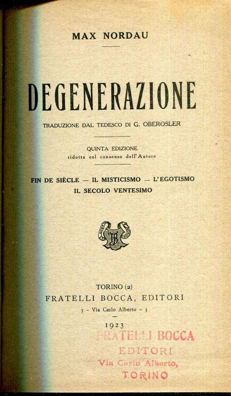 Degenerazione : fin de siécle; il misticismo; l'egotismo; il secolo ventesimo