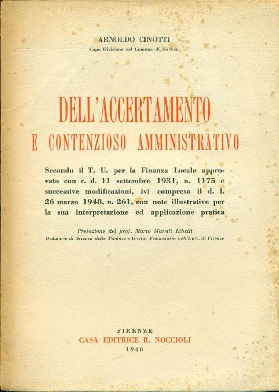 Secondo il T.U. per la Finanza Locale approvato con r.d. 11 settembre 1931, n. 1175 e successive modificazioni, ivi compreso il d.l. 26 marzo 1948, n. 261, con note illustrative per la sua interpretazione ed applicazione pratica. Pref. di M. Marsili Libelli . 8vo. pp. 80. . Molto buono (Very Good). . . .