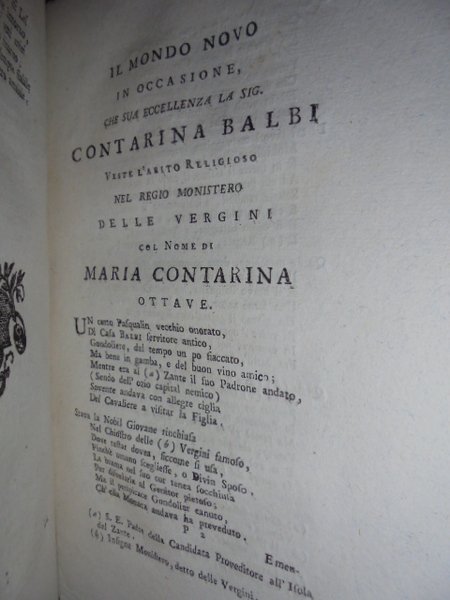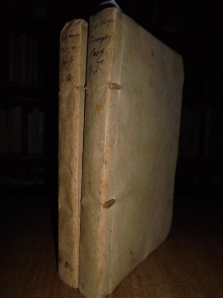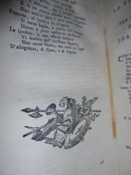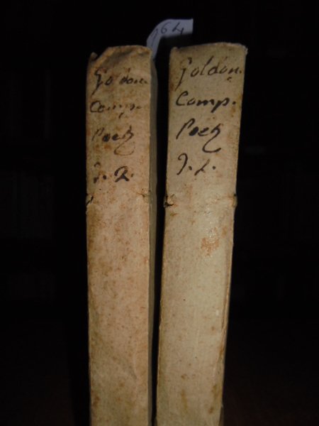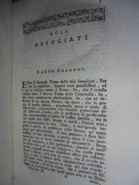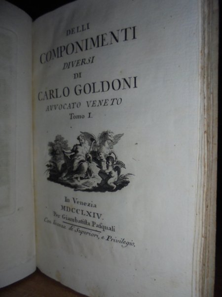 Goldoni, Carlo. Venezia, per Giambattista Pasquali, 1764. Delli Componimenti diversi di Carlo Goldoni avvocato veneto. In - 8vo (cm. 23), 2 Voll., 1 c.nn., 270 pp.; 1 c.nn., 287(1) pp. Antiporta incisa su rame f.t. nel vol. 1 e graziosa vignetta al frontespizio di ciascun volume, finalini e frontalini in xilografia. Legature in cartone coevo con titoli manoscritti al dorso. Prima edizione della raccolta di queste argute composizioni poetiche che lo stesso Goldoni (1707 - 1793) soprannomina scherzosamente nella introduzione le sue barzellette. Bell' esemplare in barbe. Neg. mob. 7