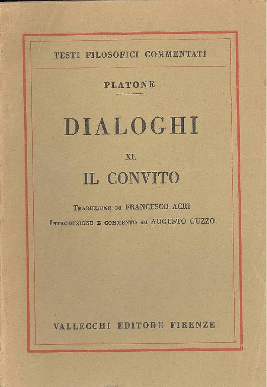XI - Il Convito. Traduzione di Francesco Acri. Introduzione e commento di Augusto Guzzo . 8vo. pp. 136. . Molto buono (Very Good). Dorso riparato. Fioriture leggere (Some light yellowing. Spine repaired). . .