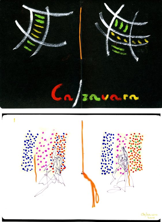 Libro d'artista. Cartoncino di color nero ripegato, illustrato fronte/retro con disegni originali dell'Artista (pastelli). All'interno altro quartino con due opere originali (acrilico). . Cm 20x15. pp. 8. . Perfetto (Mint). . . .