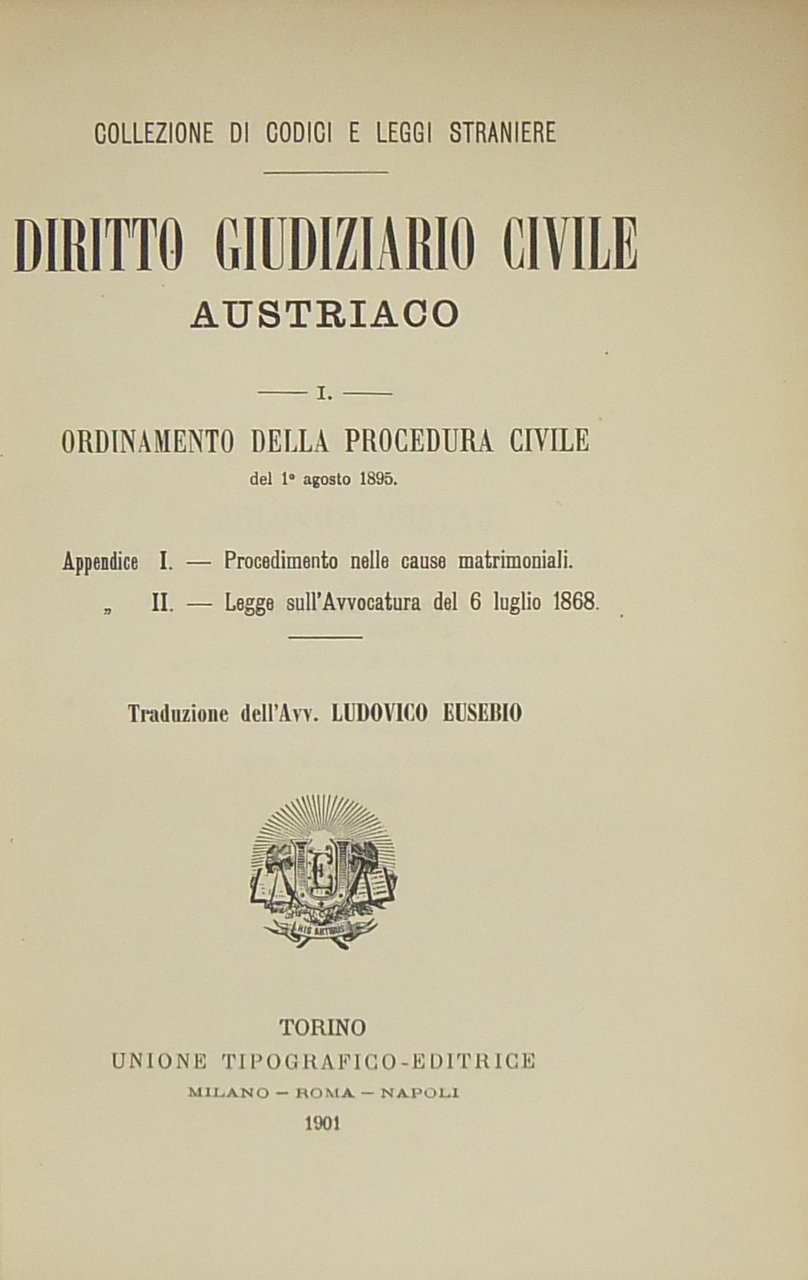 Diritto Giudiziario Civile Austriaco. Vol. I - Ordinamento della Procedura Civile del 1 agosto 1895. Appendice I - Procedimento nelle cause matrimoniali. Appendice II - Legge sull'Avvocatura del 6 luglio 1868. Vol. II - Legge sulla Organizzazione dei Tribunali del 27 novembre 1896. Legge sulla Giurisdizione e sulla Competenza del 1 agosto 1895. Ordinamento della Esecuzione del 27 maggio 1896 con note tratte dai lavori preparatori. Appendice Legge generale sui libri fondiari del 25 luglio 1871 | Libros antiguos y modernos | Austria - Eusebio Ludovico (A C. Di), Austria - Eusebio Ludovico