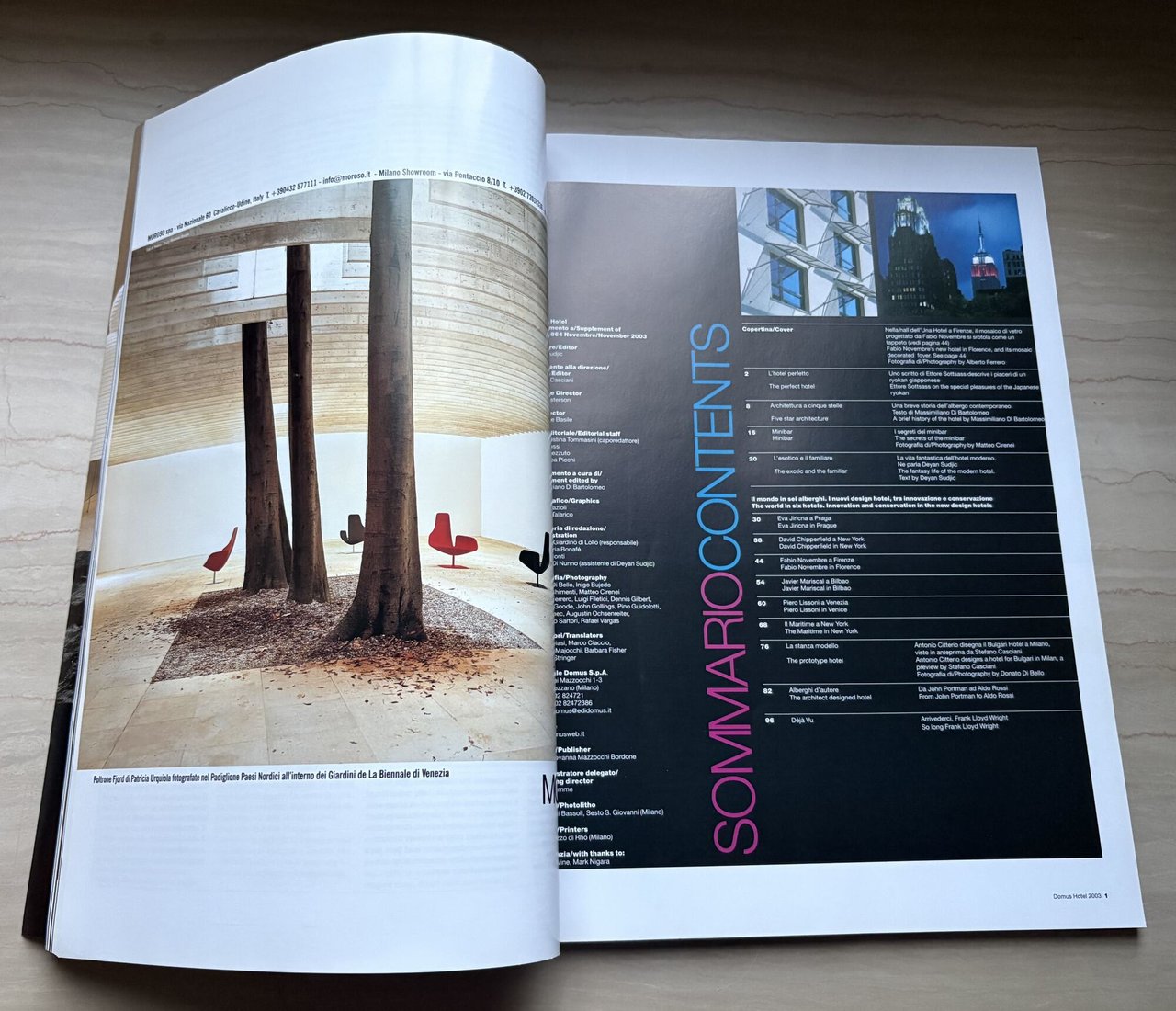 I ed.. Supplemento al n. 864 di Domus novembre 2003 (Domus: Via Gianni Mazzocchi 1-3 - Rozzano, Milano): Hotel Extra. IV/(36)+96=132/brossura satinata (Copertina/Cover: Nella hall dell'Una Hotel a Firenze, il mosaico di vetro progettato da Fabio Novembre si srotola come un tappeto/Fabio Novembre's new hotel in Florence, and its mosaic decorated foyer. Fotografia di/Photography by Alberto Ferrero). Illustrazioni a colori e in b/n. Art Director: Giuseppe Basile. Fotografia/Photography: Ramak Fazel, Federico Brunetti. Staff grafico/Graphics: Fabio Grazioli, Antonio Talarico. Stato buono.