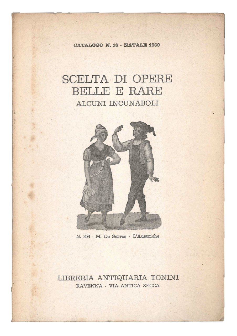 Due cataloghi della Libreria Antiquaria Tonini: nr. 13 'Scelta di opere belle e rare. Alcuni incunaboli'; nr. 46 'Bibliografia. Opere di consultazione su libri e manoscritti, arte della stampa, legature, disegni, incisioni, cataloghi in ordine alfabetico per autore con un indice di nomi infine'.