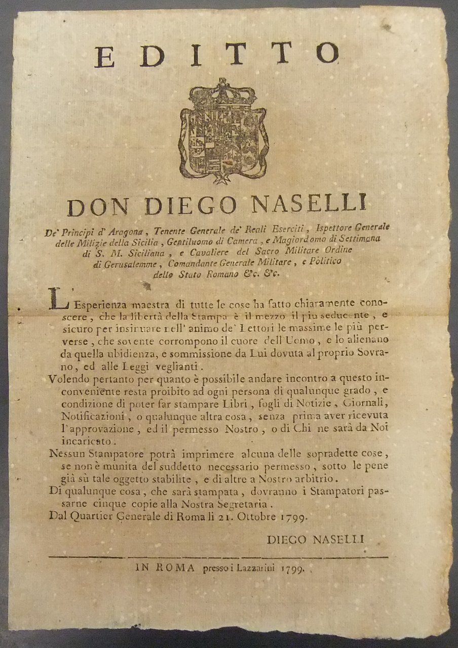 Editto Don Diego Naselli. Divieto di stampare libri, giornali o editti senza l'approvazione del Re