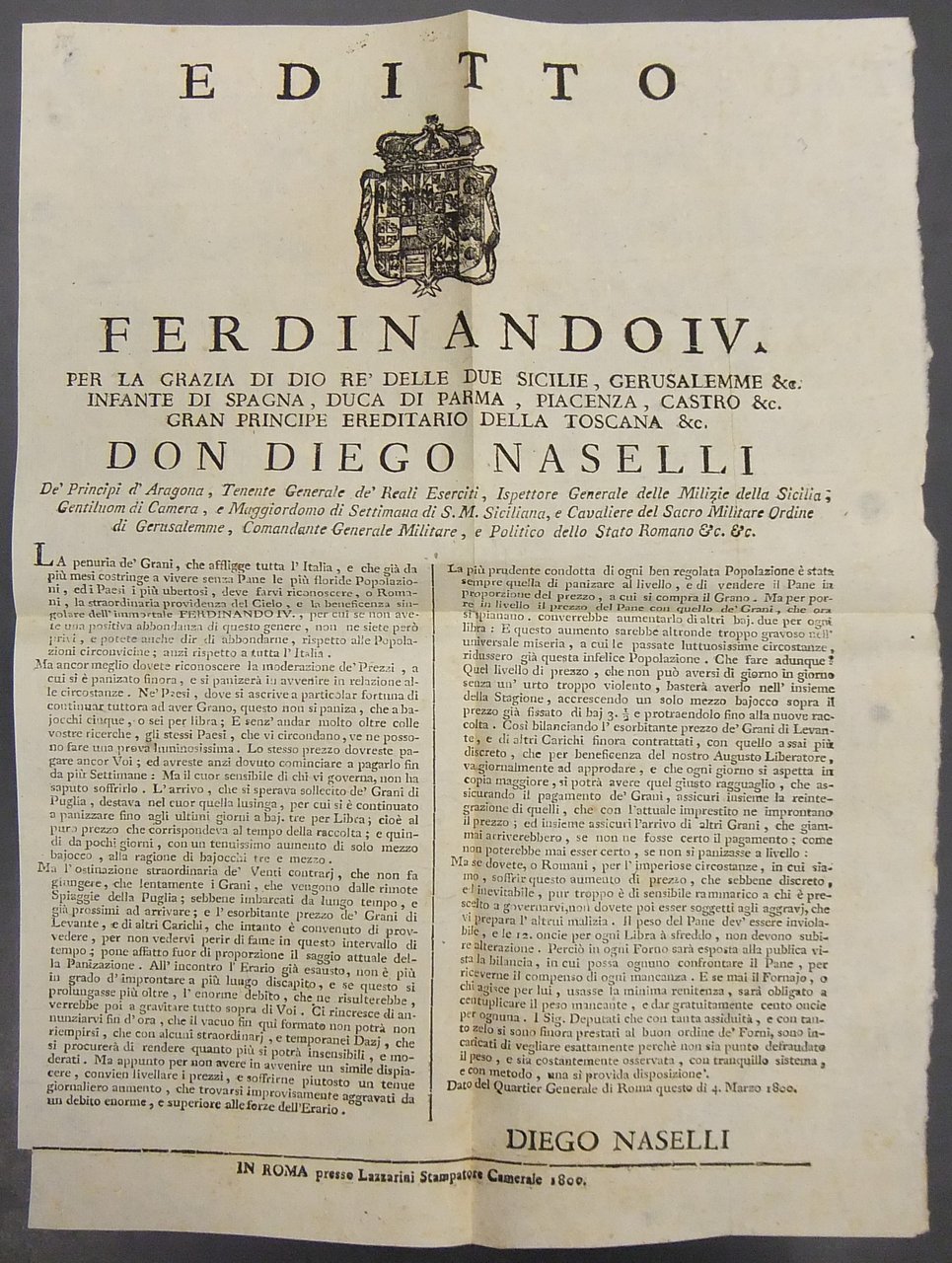 Editto Ferdinando IV. Imposizione dei dazi sul pane per livellarlo ai prezzi del grano | Libros antiguos y modernos | Ferdinando Iv - Don Diego Naselli