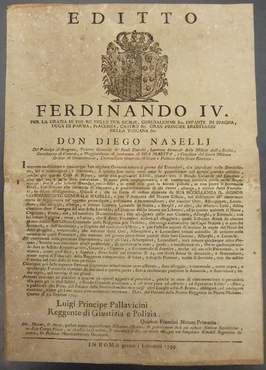 Editto Ferdinando IV. Obbligo per locandieri, osti e albergatori di avere un registro in cui annotano la sosta dei forestieri