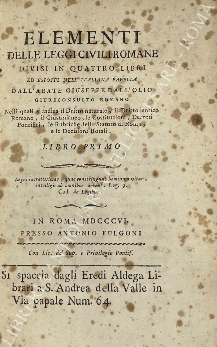 Elementi delle leggi civili romane. Divisi in quattro libri ed esposti nell'italiana favella. Nelli quali s'indica il Dritto Naturale, il Dritto Antico Romano, il Giustinianeo, le Costituzioni, Decreti Pontificj, le Rubriche dello Statuto di Roma, e le Decisioni Rotali