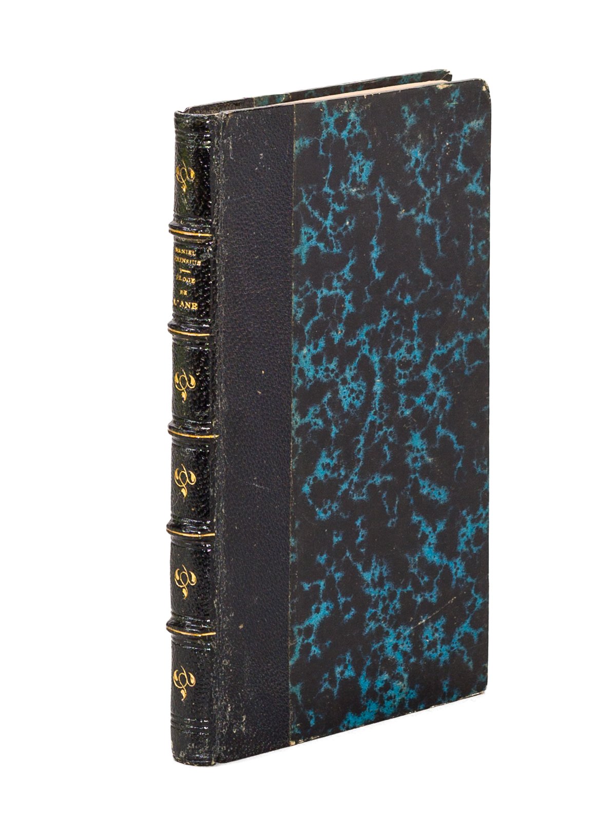 1 vol. in-18 reliure XIXe demi-chagrin noir, dos à 5 nerfs dorés, De l'Imprimerie de Honnert, Paris, 1796, 213 pp. Ainsi que le précise le traducteur de cette facétie, "quatre ânes privilégiés passent cependant glorieusement à la postérité ; celui d'Apulée, celui de Buridan, celui de Buffon, celui de Daniel Heinsius". Daniel Heinsius (1580-1655) fut l'un des plus éminents philologues et intellectuels de son temps. Brunet, III, 84