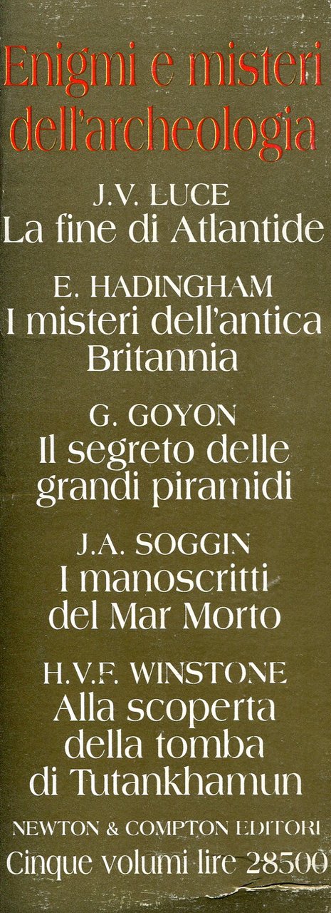 Opera in 5 volumi. Volume 1: J.V. Luce, La fine di Atlantide. Nuove luci su un'antica leggenda (Prefazione di Mortimer Wheeler. Con 92 illustrazioni in bianco e nero in tavole fuori testo) - Volume 2: Evan Hadingham, I misteri dell'antica Britannia (Traduzione di Celso Balducci. Con alcune illustrazioni in bianco e nero nel testo) - Volume 3: Georges Goyon, Il segreto delle piramidi. (Introduzione di Christiane Desroches Noblecourt. Traduzione e adattamento di Sergio Bosticco. Con alcune illustrazioni in bianco e nero nel testo) - Volume 4: J. Alberto Soggin, I manoscritti del Mar Morto (Presentazione di Sabatino Moscati) - Volume 5: H.V.F. Winstone, Alla scoperta della tomba di Tutankhamun (Con illustrazioni in bianco e nero in tavole fuori testo) . 8vo. pp. 176 + 214 + 154 + 208 + 334. . Molto buono (Very Good). . . .