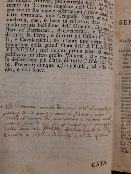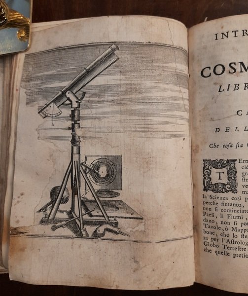 In 8vo, cm. 13,5 x 18h; Antiporta (con mancanza del margine inferiore bianco, che è stato restaurato, la parte incisa è completa) + 22 carte non numerate (44 pagine) + 416 pagine. La tavola n. 21, "Disegno del cavalletto per postare il cannocchiale (pag. 208), è mancante della figura del personaggio, che di solito si trova ripiegata. Con 31 tavole incise fuori testo, su 38 complessive (incluso l'antiporta). Legatura in piena pergamena antica rimontata e ripulita, titolo manoscritto sul dorso. Qualche alone di umidità su alcune carte, interessante nota coeva manoscritta a carta 4 sul recto. Tagli spruzzati di rosso. Anche se mancante di 7 tavole, resta un esemplare molto raro a trovarsi. HOUZEAU AND LANCASTER 8006; RICCARDI I 273-5. Codice inv.1025888