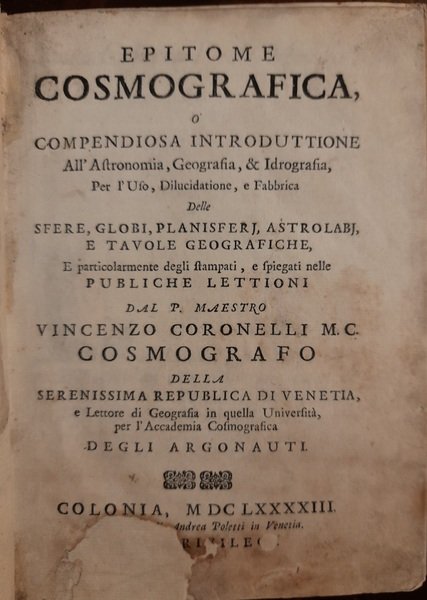 O sia compendiosa introduttione all'Astronomia, Geografia, e Idrografia, per l'uso, dilucidatione e fabbrica delle Sfere, Globi, Planisferi, Astrolabi, e Tavole Geografiche, e particolarmente degli stampati e spiegati nelle pubbliche lettioni dal P. Maestro VINCENZO CORONELLI M. C. COSMOGRAFO della Serenissima Repubblica di Venetia, e lettore di Geografia in quella università, per l'Accademia Cosmografica DEGLI ARGONAUTI.