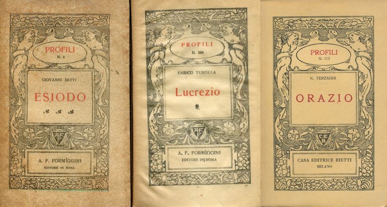. 16mo. pp. 68. . Molto buono (Very Good). . . . Si allegano due libri: Enrico TUROLLA, Lucrezio (Formiggini, Profili, 1929) - N. TERZAGHI, Orazio (Bietti, Profili, 1939). Molto buoni