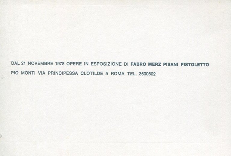 Cartoncino d'invito alla mostra delle opere di Luciano Fabro, Mario Merz, Vettor Pisani e Michelangelo Pistoletto tenutasi presso la galleria Pio Monti, Via Principessa Clotilde, Roma, nel novembre 1978 . Cm 10x15. . . Ottimo (Fine). . . .
