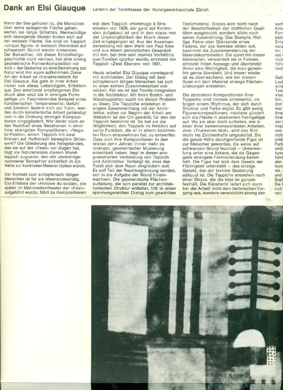 Texile gestaltung an der Kunstgewerbeschule Zurich. 27 November1965 bis 9 Januar 1966. Wegleitung 263 des Kunstgewerbemuseums der Stadt Zurich. Il catalogo è composto da 5 fogli (cm 41x57) più volte ripiegati contenuti in una custodia in cartoncino . 16mo. pp. . . Molto buono (Very Good). . . .