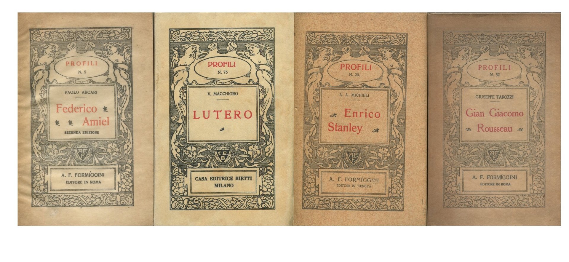 Un ritratto in antiporta . 16mo. pp. 80. . Molto buono (Very Good). Pagine chiuse (Uncut pages). Seconda edizione (2nd Edition). . Si allegano tre libri: V. MACCHIORO, Lutero (Bietti, Profili, 1939. Pagine 102) - Giuseppe TAROZZI, Gian Giacomo Rousseau (Formiggini, Profili, 1926. Pagine 100) - A.A. MICHIELI, Enrico Stanley (Formiggini, Profili, 1913. Pagine 78). Molto buoni