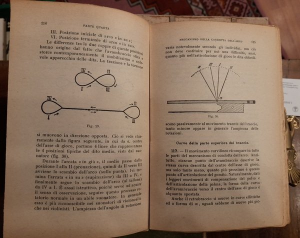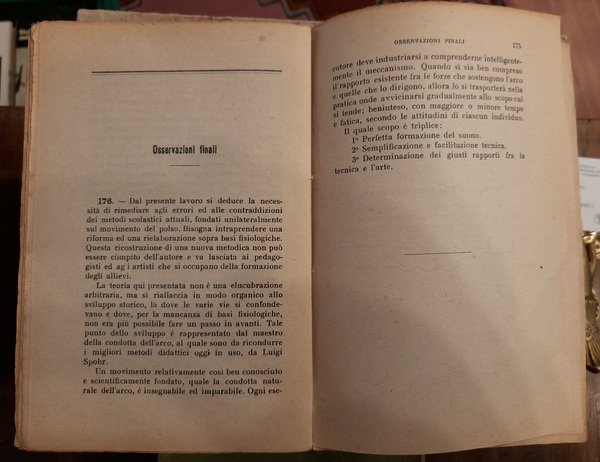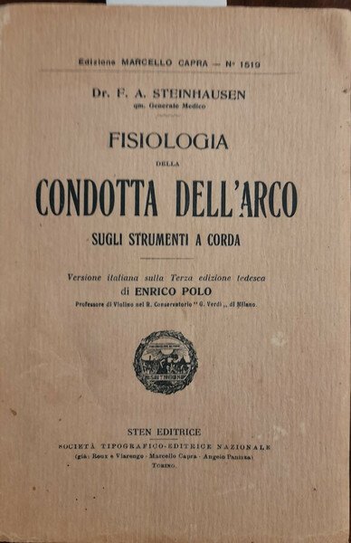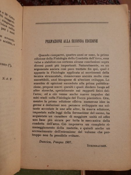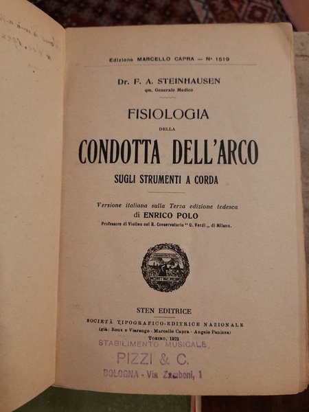 Versione italiana sulla terza edizione tedesca di Enrico Polo, professore di Violino nel R. conservatorio "G. Verdi" di Milano. In 8vo, pag. XXIII (1) + 187 (1), deica manoscritta sull'occhieto del 1922, allegati in fine al volume 2 fogli manoscritti su una facciata. Brossura editoriale beige, con alcune figure nel testo. Ottima la conservazione. Codice inv.1030911