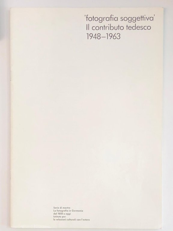 Catalogo di mostra, Institut für Auslandsbeziehungen di Stoccarda. Una mostra dell'Istituto per le relazioni culturali con l'estero, all'interno della rassegna "La fotografia in Germania dal 1950 a oggi". Ilustrato nel testo con alcune fotografie in bianco e nero . Cm 29,5x20,5. pp. 30. . Molto buono (Very Good). Senza copertine (Without covers). . .