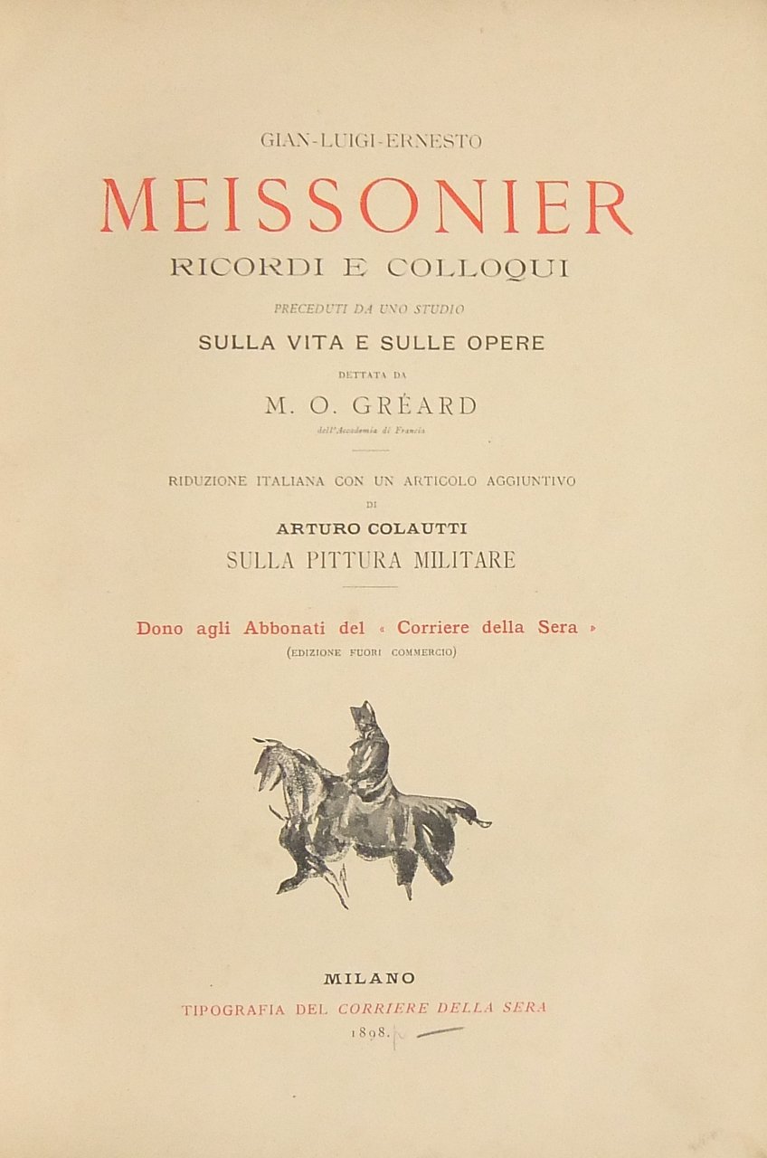 Gian Luigi Ernesto Meissonier. Ricordi e colloqui preceduti da uno studio sulla vita e sulle opere dettata da M.O. Greard. Riduzione italiana con un articolo aggiuntivo di Arturo Colautti sulla pittura militare.