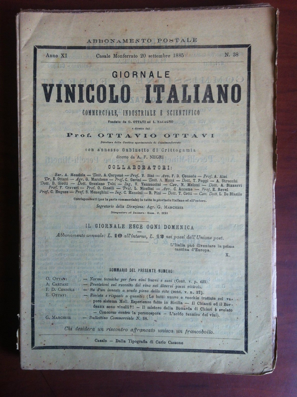 Giornale Vinicolo Italiano Anno XI n^38 Casale M.to 20 Settembre 1885- E14719