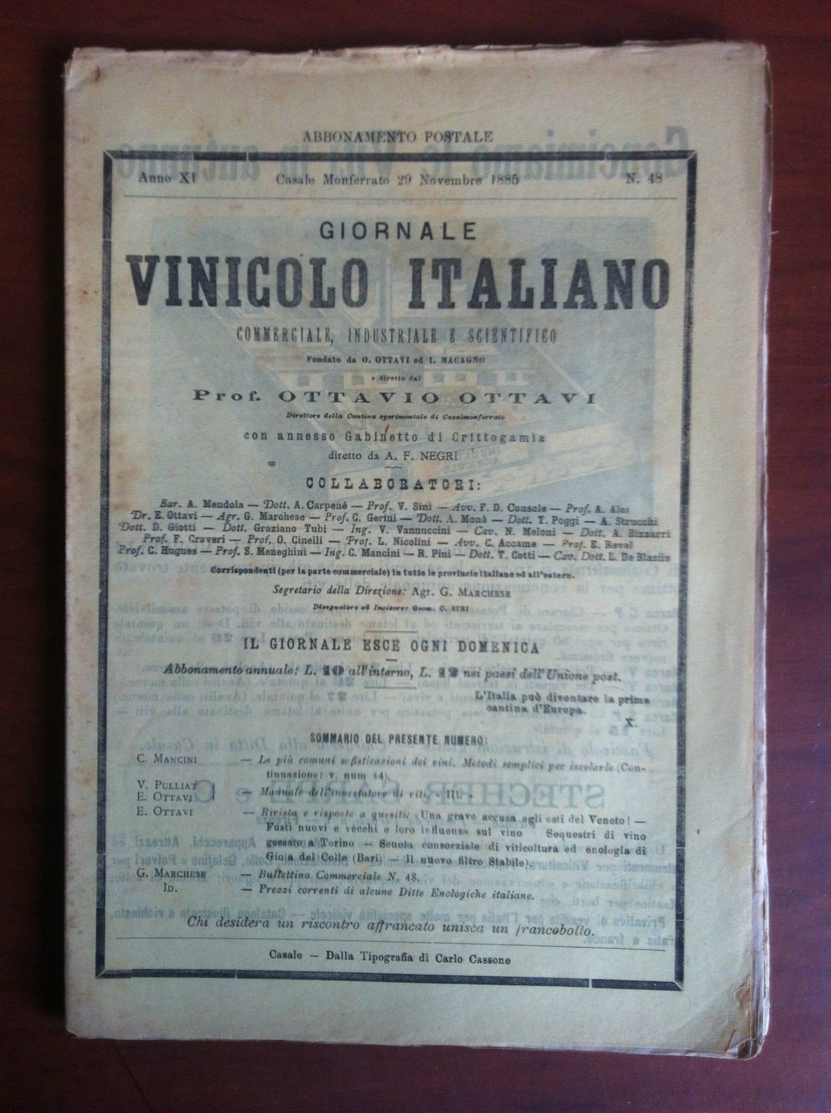 Giornale Vinicolo Italiano Anno XI n^48 Casale M.to 29 Novembre 1885 - E14729