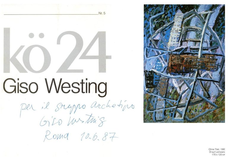 Testo di Wilheim Bojescul. Con 16 illustrazioni a colori a piena pagina. Biografia con una fotografia dell'artista . Cm 26x21. pp. 20. . Molto buono (Very Good). . Prima edizione (First Edition). . Giso Westing (Hannover, 1955 ) ha studiato all'Accademia di Belle Arti di Braunschweig dal 1975 al 1982. Westing è stato membro dell'Associazione degli Artisti Tedeschi dal 1988 al 1997, con la quale ha partecipato alle principali mostre annuali della nel 1985 (presso l' Associazione d'Arte di Hannover ), nel 1987 (presso la Galleria d'Arte di Brema ), nel 1988 (presso la Galleria Civica di Stoccarda ) e nel 1990 (presso l' Accademia delle Arti di Berlino ). Per il suo lavoro ha ricevuto la borsa di studio Villa Massimo a Roma (1986/87), il premio Sprengel (1990) e il premio d'arte del gruppo parlamentare SPD nel Parlamento della Bassa Sassonia (2005). I suoi dipinti sono stati esposti in 50 mostre personali e collettive in Germania e all'estero. Dal 2011 al 2023 è stato curatore della “Società per la promozione dell'arte nella Bassa Sassonia”.