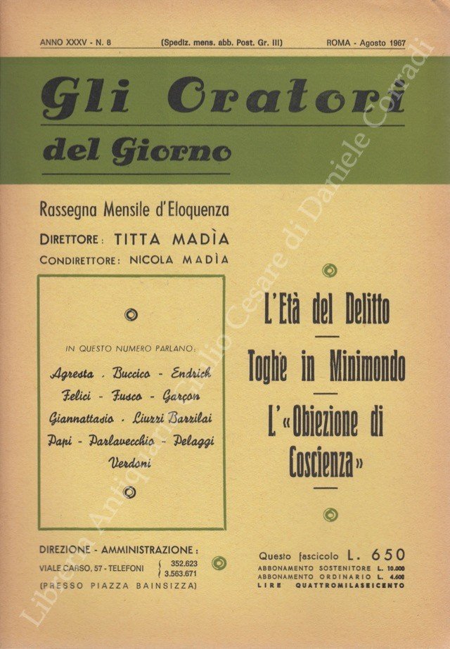 Gli oratori del giorno. Rassegna mensile d'eloquenza. Anno XXXV - Numero 8. Agosto 1967 | Libros antiguos y modernos | Giannattasio C. Et Alii