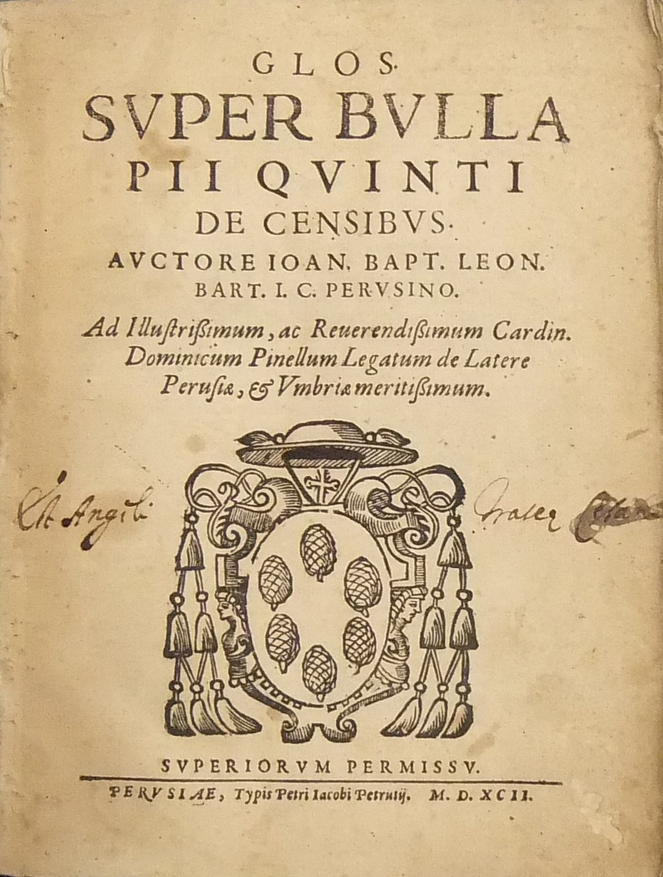 Glos. super bulla Pii Quinti de censibus Auctore Ioan. Bapt. Leon. Bart. I.C. Perusino. UNITO A: Glos. super bulla Pii quarti de societate officiorum Auctore Ioan. Bapt. Leon. Bart. I.C. Perusino