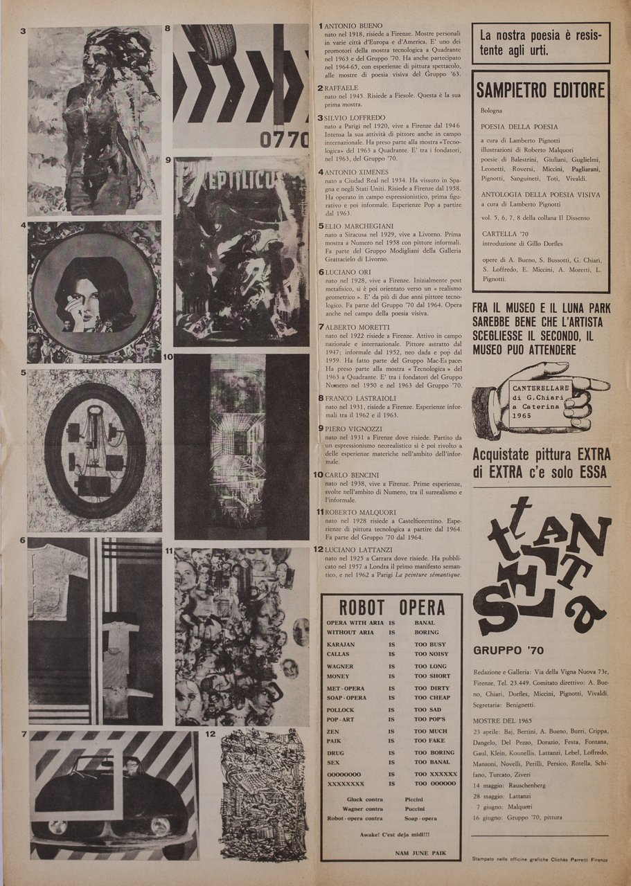 Manifesto del Terzo Festival del Gruppo '70 tenutosi a Firenze nel 1965 presso la Galleria La Vigna Nuova e la Galleria Numero nei mesi di maggio, giugno e luglio. Contiene il programma del festival (che prevedeva dibattiti su poesia, poesia visiva e pittura, una mostra d'arte, letture di poesie e concerti) e l'elenco dei partecipanti, tra cui Giuseppe Chiari, Dick Higgins, Philip Corner, John Cage, Nam June Paik, Wolf Vostell, Nanni Balestrini, Achille Bonito Oliva, Lamberto Pignotti, Elio Pagliarani, Antonio Porta, Edoardo Sanguineti, Emilio Isgrò, Steliomaria Martin, Lucia Marcucci, Adriano Spatola, et al. Stampato fronte-retro con due testi/manifesti sulla musica, la poesia e la poesia visiva, vari disegni e slogan, una poesia di Nam June Paik (''Robot Opera''). Riproduzioni di opere di Antonio Bueno, Raffaele, Silvio Loffredo, Antonio Ximenes, Elio Marchegiani, Luciano Ori, Alberto Moretti, Franco Lastraioli, Piero Vignozzi, Carlo Bencini, Roberto Malquori e Luciano Lattanzi . Poster cm 50x35. pp. 2. . Molto buono (Very Good). . . . ''Durante questo terzo festival del Gruppo '70 verrà presentata per la prima volta al pubblico quella che pensiamo essere la prima antologia di poesia visiva, non solo in Italia ma nel mondo: curata da Lamberto Pignotti e pubblicata da Enrico R. Sampietro essa contiene le poesie visive di quindici autori: Nanni Balestrini, Achille Bonito Oliva, Danilo Giorgi, Alfredo Giuliani, Emilio Isgrò, Luca (Luigi Castellano), Lucia Marcucci, Steliomaria Martini, Eugenio Miccini, Luciano Ori, Antonio Porta, Lamberto Pignotti, Adriano Spatola, Luigi Tola, Guido Ziveri. [...] Ma ora la poesia ha la possibilità di passare all'offensiva e lo farà, magari passando prima attraverso una fase di operazioni commandos e di guerriglia culturale. E la neutralità (l'anesteticità) sarà sempre meno possibile: dovrete sempre più essere per o contro la poesia. A vostro rischio e pericolo.'' (dal testo del manifesto).