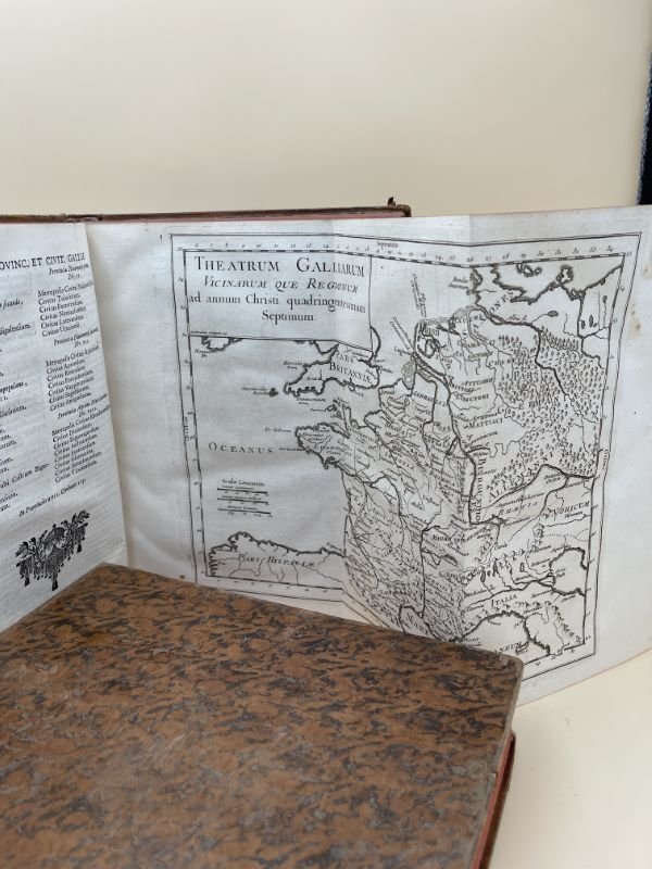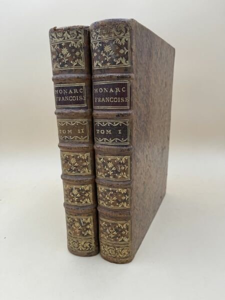 chez Pierre François Griffard 1742 A Paris, chez Pierre François Griffart, 1742. 2 volumes In-4 plein veau de l'époque, dos à nerfs très ornés, pièce de titre et de tomaison de maroquin rouge, tranches rouges, gardes de papier marbré. viii + 650 + viii + 669 pages + 1 page pour le privilège et l'approbation. Bien complet de la carte dépliante "Theatrum galliarum vivinarum que regionum ad annum christi quadrigentesimum septimum". Nouvelle édition , revue, corrigée & augmentée. Coins légèrement émoussés, petit manque de cuir à une coiffe sans gravité. Edition complète en 2 volumes. Bel exemplaire.