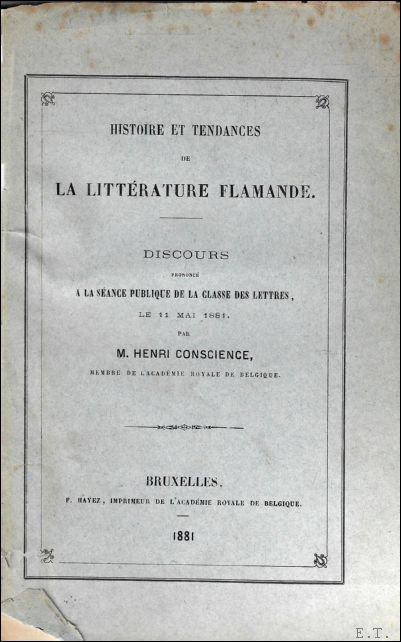 Oorspronkelijk uitgevers omslag, 10 pag. **Cette dition fran aise est une surimpression des registres de l'acad mie. discours Histoire et tendances de la litt rature flamande // *** is wel degelijk de tekst van de openbare lezing van de Acad mie Royale die Conscience op 11 mei 1881 in Brussel gaf. Hij gaf ze in het Frans omdat een groot deel van de aanwezigen het Nederlands niet machtig was. De tekst is ook apart uitgegeven in het Nederlands. Deze Franse uitgave is een overdruk uit de verslagen van de academie.(Johan Vanhecke)