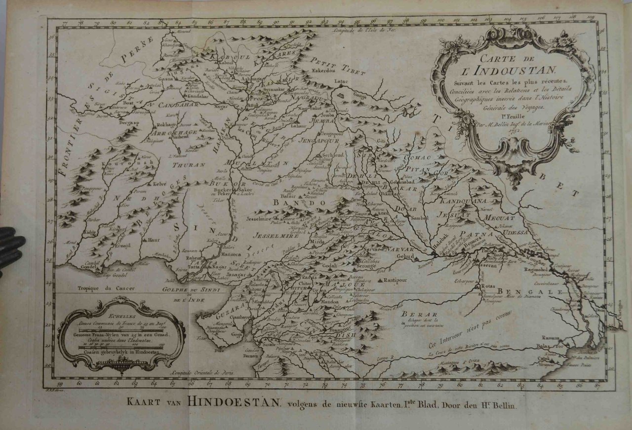 In-4 (cm. 25,5), pp. viii, 508 (4). Frontespizio in rosso e nero, testate e 31 belle tavole incise in rame di cui molte ripiegate fuori testo. Solida legatura coeva in mezza pelle con punte, dorso a nervi con fregi e titoli in oro su tasselli. Piatti e sguardie marmorizzati, tagli colorati. Solo un foro di tarlo interessa una ventina di carte centrali, ma esemplare marginoso, genuino e ben conservato. Le tavole sono stampate su carta forte e raffigurano vedute, scene popolari, costumi e carte geografiche dei luoghi visitati. Si tratta del volume 13 della celebre storia dei viaggi di A.F. Prevost nell'edizione olandese che segue l'originale francese con, rispetto a quest'ultimo, importati correzioni ed aggiunte. Il presente volume contiene le relazioni di viaggiatori nell'Indostan ed in generale in tutta l'India.