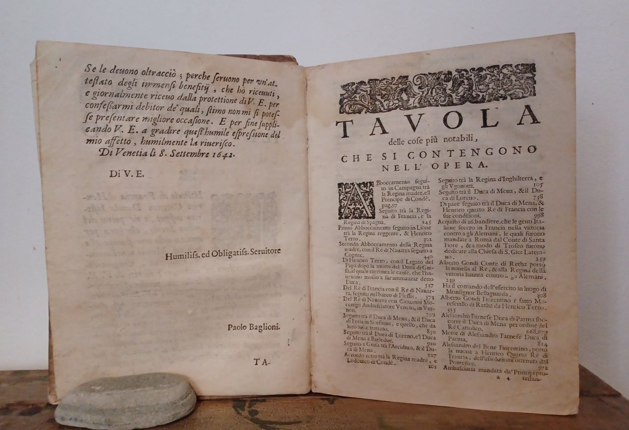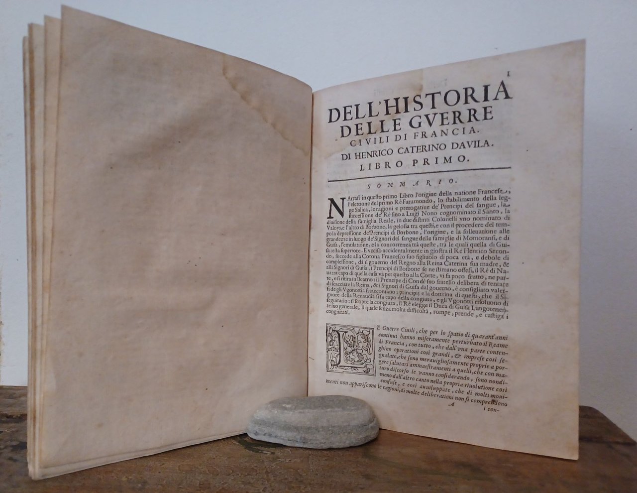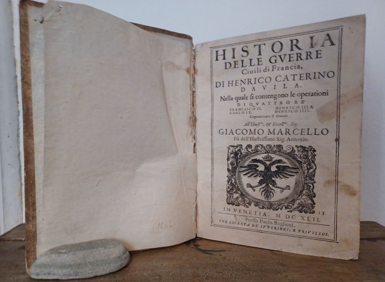 Volume in 4 antico, legatura in cartonato rustico d'epoca (dorso scoperto, ben legato, nervi a vista), sguardie, manca la carta in a1 (occhiello), frontespizio con bella grande marca con l'aquila bicipite, 15 cc. non numerate (dedicatoria ed indice), 1056 pp. Una fra le prime impressioni del lavoro del Davila, talmente noto da non aver bisogno d'ulteriore presentazione. Il volume in bello stato, due piccole macchiette al frontespizio, alcuni quaderni leggermente arrossati, poche ed ininfluenti mende d'uso. Edizione poco comune.