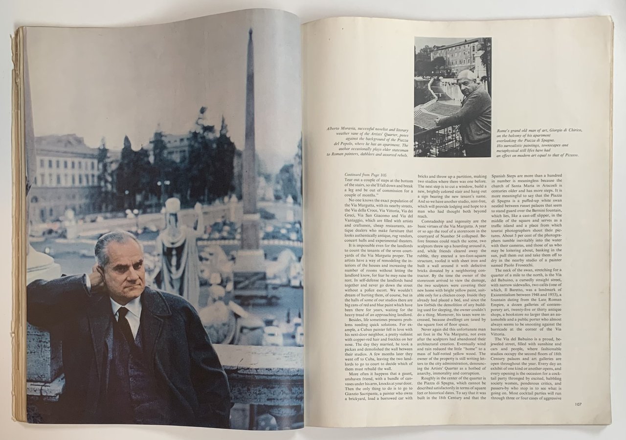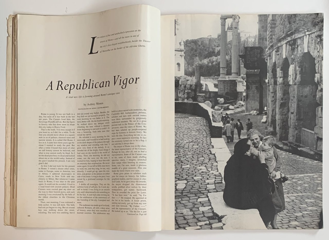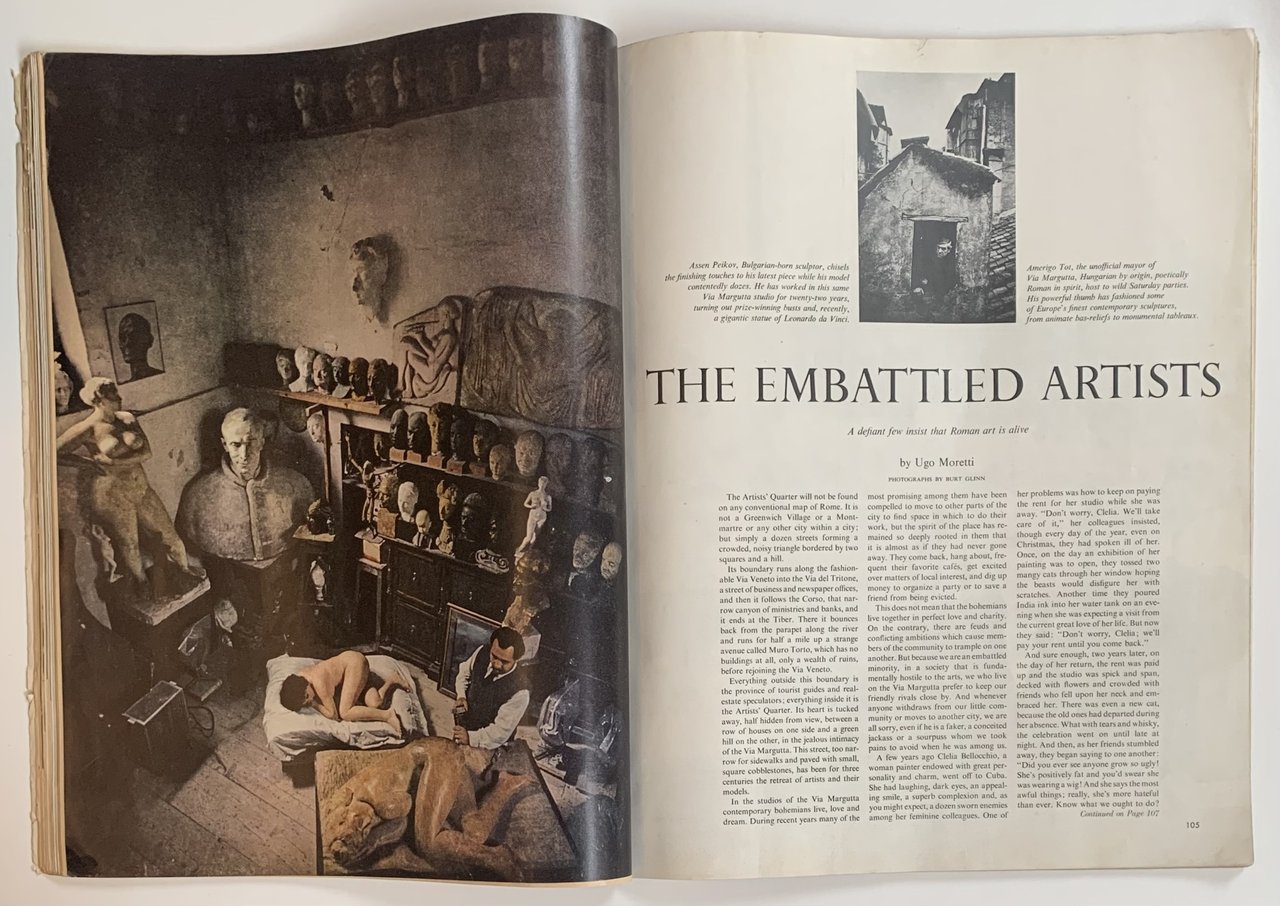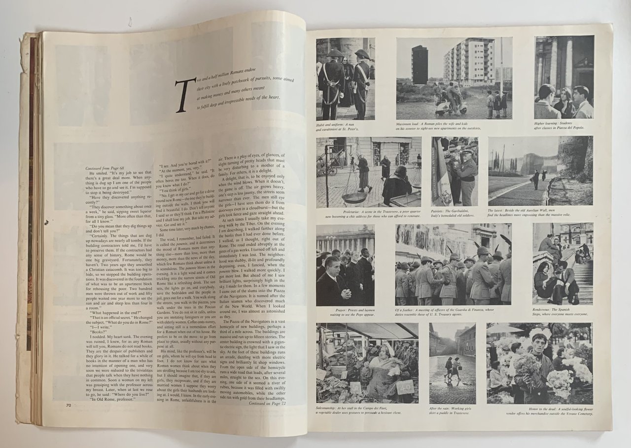 Numero monografico della rivista interamente dedicato alla città di Roma. Gli articoli sono firmati da Aubrey Menen, Robert Graves, Sean O'Faolain, Edith Templeton, William Demby, Raymond Postgate, Arnold Ehrlich, Tom Sterling, Clifton Fadiman, et al. Gli articoli sono illustrati da fotografie in bianco e nero e a colori di Henry Cartier-Bresson, Elliott Erwitt, Arnold Newman, Slim Aarons, Burt Flinn. Tra i testi: "The Embattled Artists" di Ugo Moretti con foto di Amerigo Tot, Assen Peikov nel suo studio di Via Margutta, Alberto Moravia, Giorgio De Chirico, Pietro Consagra, Anna Salvatore Copertina a colori di George Giusti. Cm 34x27. pp. 234. . Buono (Good). Copertina sporca e sciupata con fioriture. Odore di umidità tra le pagine (Cover worn, with foxing The pages smell slightly damp). . .