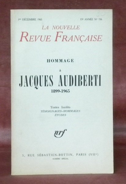Hommage à Jacques Audiberti 1899-1965. Textes inédits, témoignages-hommages, études.La Nouvelle Revue Française. 13e année N°156.