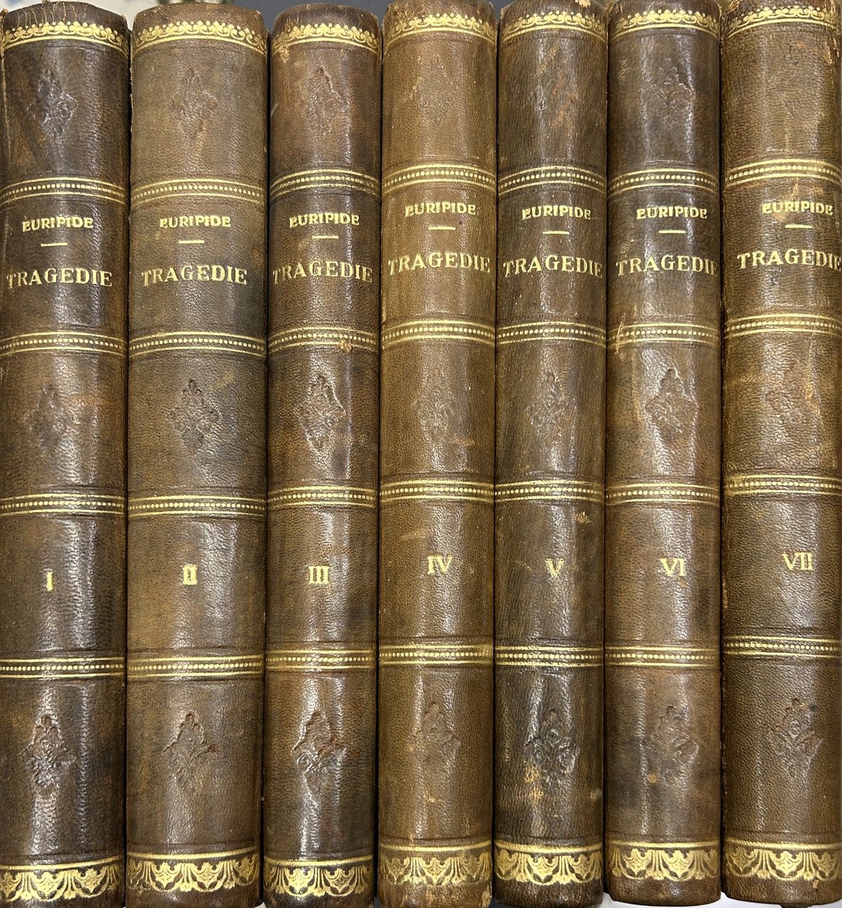 I poeti greci tradotti da Ettore Romagnoli. Con incisioni di A. De Carolis e A. Moroni. Euripide - Tragedie: Vol. I - Le baccanti; Ione. Vol. II - Medea; Alcesti; La fenice. Vol. III - Le supplici; Ercole; Ippolito. Vol. IV - Gli Eraclidi; Ifigenia in Aulide; Ifigenia in Tauride. Vol. V - Reso; Le Troadi e Cuba. Vol. VI - Elettra; Oreste. Vol. VII - Andromaca; Elena; Ciclope