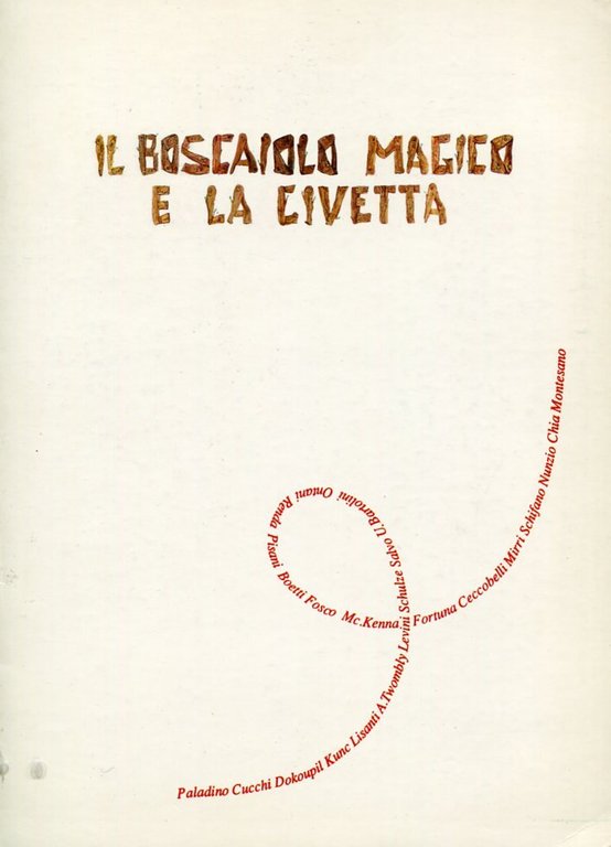 Pieghevole d'invito alla presentazione della favola "Il boscaiolo magico e la civetta" di Francesco Serrao, presso l'Associazione culturale Pio Monti, Roma, il 30 Maggio 1989. Il volume, edito da Giancarlo Politi è accompagnato dalle illustrazioni di Paladino, Cucchi, Dokoupil, Kunc, Lisanti, A. Twombly, Levini, Schulze, Salvo, U. Bartolini, Ontani, Renda, Pisani, Boetti, Fosco, McKenna, Fortuna, Ceccobelli, Mirri, Schifano, Nunzio, Chia, Montesano. Le opere degli artisti saranno messe in mostra presso la galleria Pio Monti a Roma . Cm 17x12. . . Ottimo (Fine). . . .