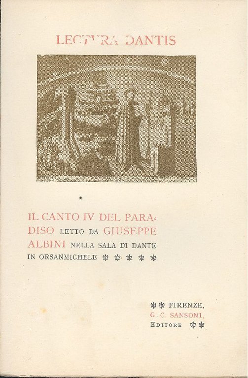 Letto da G. Albini nella sala di Dante in Orsanmichele . 8vo. pp. 36 + 8. . Molto buono (Very Good). Copertina con piccole mancanze (Lacks to cover). . .