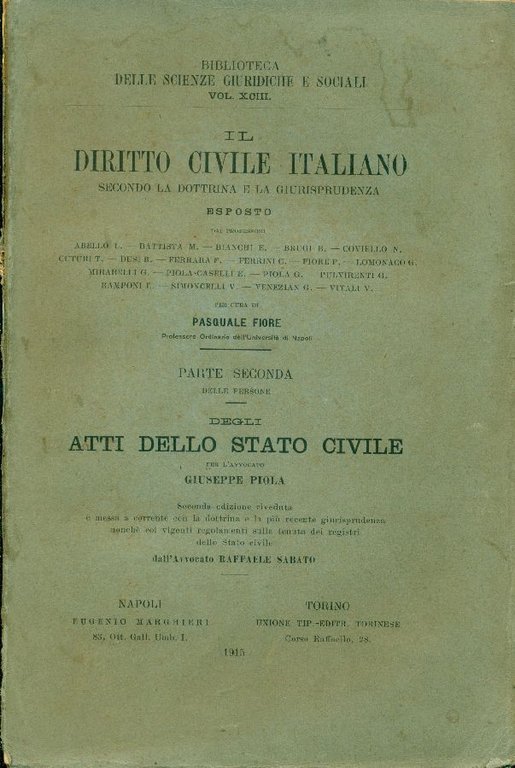 Il diritto civile italiano secondo la Dottrina e la Giurisprudenza, parte seconda: delle Persone. Degli atti dello stato civile. Edizione riveduta e messa a corrente con la dottrina e la più recente giurisprudenza nonché coi vigenti regolamenti sulla tenuta dei registri dello Stato civile dall'Avvocato Raffaele Sabato . 8vo. pp. 640. . Molto buono (Very Good). . Seconda edizione riveduta. .