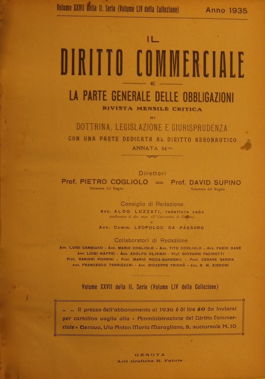 Il Diritto Commerciale e la parte generale delle obbligazioni. Diretta da: P. Cogliolo, D. Supino, L. Parodi. Annata 1935. Parte I - Dottrina. Parte II - Giurisprudenza | Libros antiguos y modernos | Cogliolo P. - Supino D. - Parodi L.