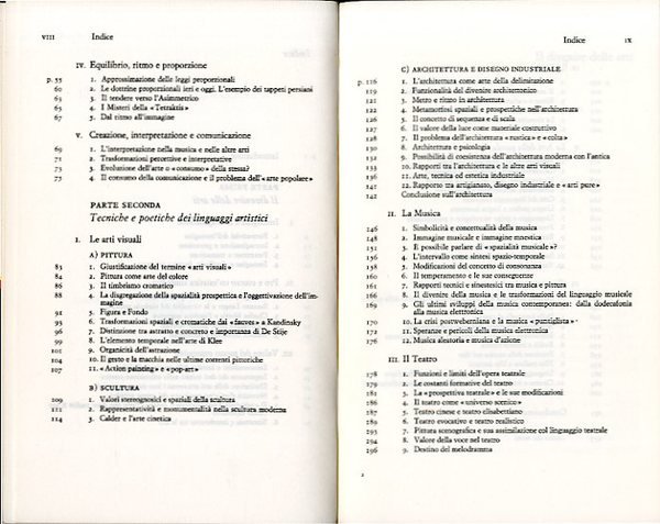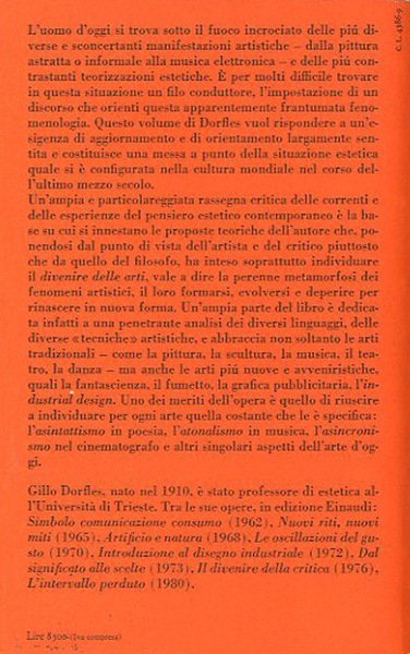 2. ed. X, 284 p. ; 19 x 12 cm. Reprints Einaudi. L'uomo oggi si trova sotto il fuoco incrociato delle più diverse e sconcertanti manifestazioni artistiche e delle più contrastanti teorizzazioni estetiche. È per molti difficile trovare in questa situazione un filo conduttore, l'impostazione di un discorso che orienti questa frantumata fenomenologia. Il volume di Dorfles vuol rispondere a un'esigenza di orientamento largamente sentita e costituisce una messa a punto della situazione estetica quale si è configurata nella cultura mondiale nel corso della seconda metà del Novecento. Brossura editoriale, coperta in cartoncino flessibile colorato (arancione, b/n). Codice libreria 1457.